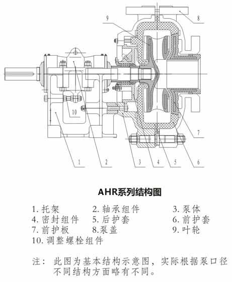 5.AHR型渣漿泵過流部件為橡膠材料。適用于輸送細顆粒及腐蝕性渣漿。其泵體、泵蓋及傳動部件等與AH型泵通用。